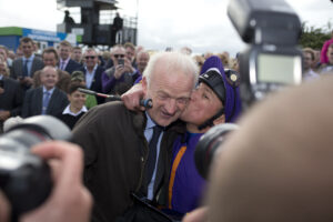 Frankie Dettori celebrating with Willie Mullins’ after the pairs win with Wicklow Brave in the Irish St Leger